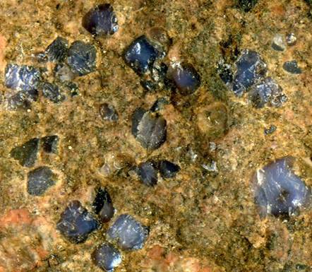 Llanite (field of view 1.6 cm across) with nice dark bluish-gray quartz phenocrysts. Blue is a rare color in quartz.