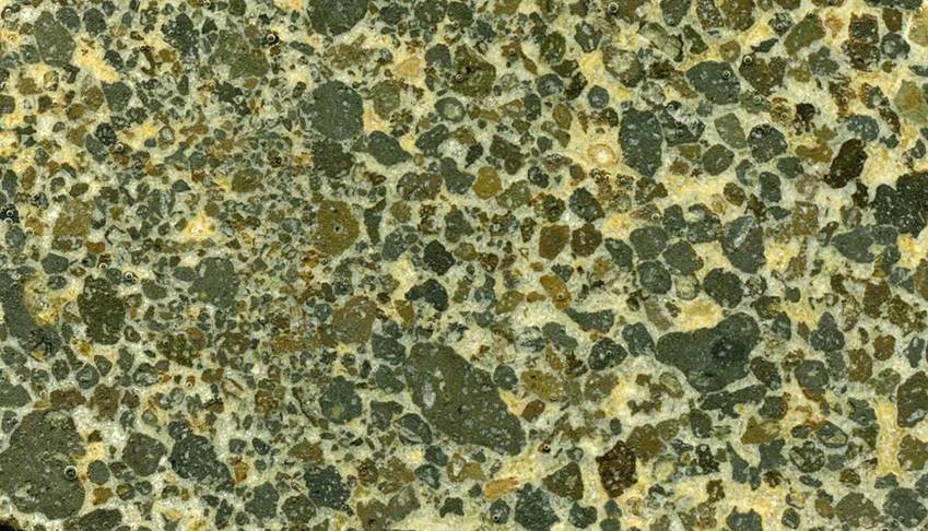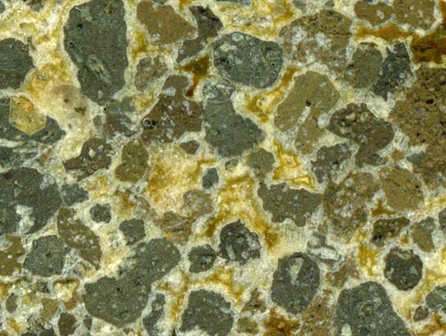 Olivine melilitite lapillistone (above & below; wet, cut surfaces; above: 5.3 cm across; below: 1.8 cm across) with grains of olivine melilitite (gray & brown) cemented together by calcite (yellow).