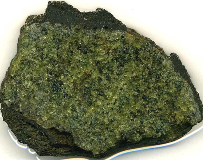 Spinel lherzolite (wet, cut surface; 5.8 cm across at its widest) - a Neoproterozoic-aged mantle xenolith in Pleistocene basalt from Mt. Leura, Victoria, Australia. The lava & enclosed xenolith were erupted about 22 thousand years ago.