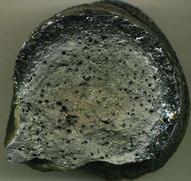 Vesiculated tachylite (field of view ~4.0 cm across) - the lithology of this lava tube ceiling sample is best revealed on the broken edges. This cross-section view shows the the rock cooled very quickly - the material itself is glassy, with very few to no crystals, but with abundant preserved gas bubbles (vesicles). The lithology is a vesiculated tachylite, in other words, a black, frothy-textured, basalt glass.