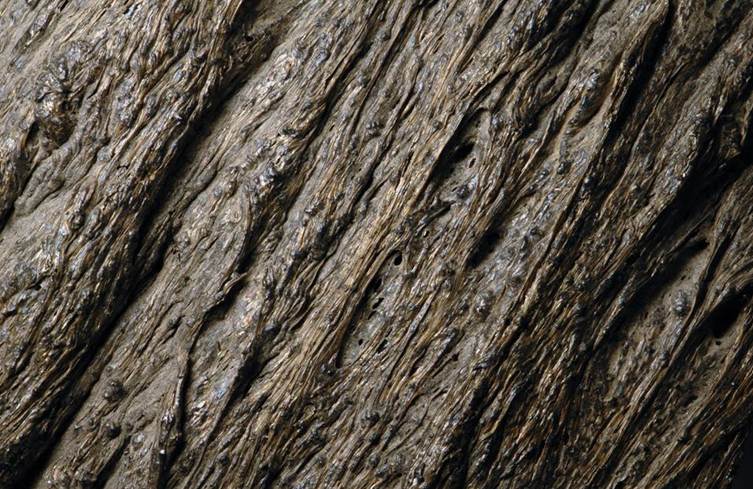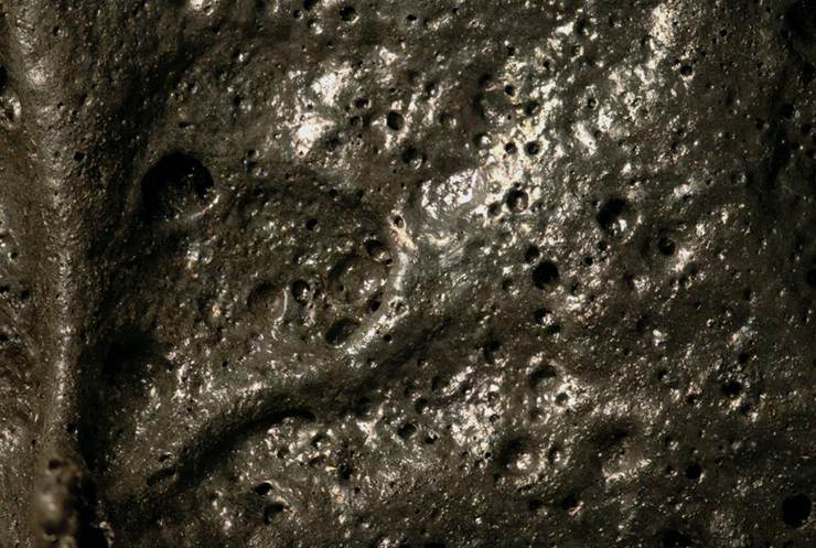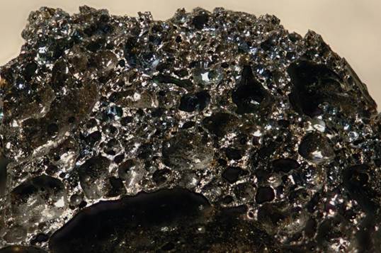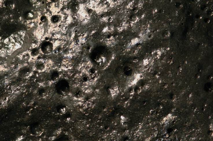 Tachylite (above & below; above: field of view ~8.6 cm; below: field of view ~4.2 cm) - interior surface of lava tube ceiling sample. Unlike the external surface, the inside roof of the lava tube doesn't display stretched textures. The heat inside the lava tube was sufficient to partially re-melt already solidified lava. This surface is relatively smooth and lustrous, somewhat like chocolate cake batter.