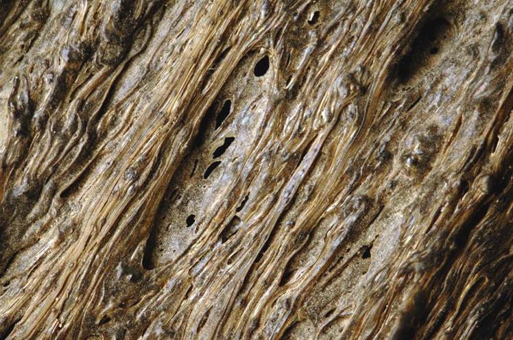 Sideromelane & Tachylite (above & below; above: field of view ~9.3 cm across; below: field of view ~3.2 cm across) - exterior surface of a lava tube ceiling sample. The surface has abundant, consolidated basalt glass filaments, formed by stretching. In cross-section view (see below), the rock is seen to be a highly vesiculated basaltic glass. The rich golden brown-colored basaltic glass is called sideromelane. The blackish-colored basaltic glass is called tachylite.
