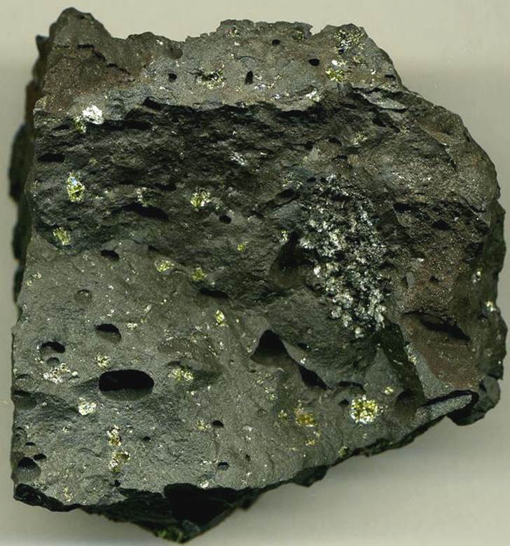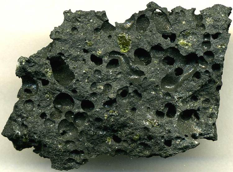 These rocks are vesicular porphyritic olivine basalts (more technically, they can be called vesicular tholeiitic picrite basalts). They have abundant subrounded to stretched vesicles and common large greenish forsterite olivine phenocrysts. The basalt matrix is glassy-looking, very finely crystalline plagioclase feldspar & pyroxene. The large sample shown above has an obvious black-and-white speckled xenolith of gabbro from the lower oceanic crust.