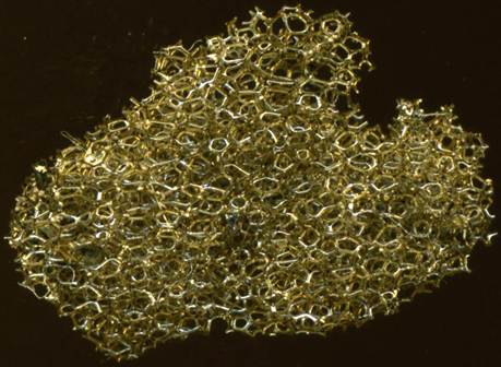 Reticulite (1.8 cm across) - here's a sample of reticulite (a.k.a. thread-lace scoria). It is greenish-brown, highly vesiculated basalt glass (sideromelane). Nearly all of the cells walls of the gas bubbles have burst, resulting in a complex three-dimensional honeycomb structure.