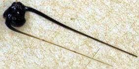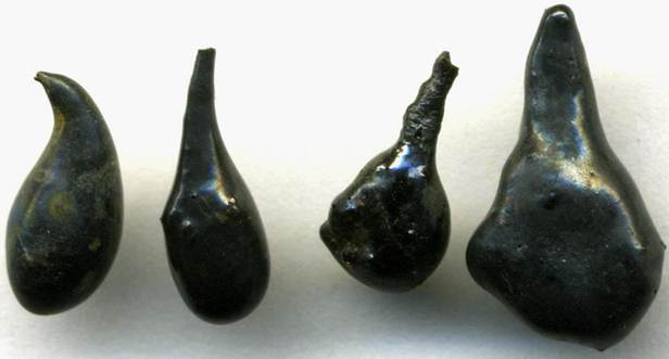 Pele's tears are small, raindrop-shaped blebs of quickly solidified basalt lava. The technical term for such structures is achneliths. These Hawaiian achneliths represent rapidly chilled basalt lava spray blown by winds during a high lava fountain eruption. The broken tips of the three smaller specimens reveal that they are composed of black, finely-vesiculated basalt glass (tachylite). In the field, Pele's Tears are many times seen attached to the distal ends of extremely long threads of mafic glass (Pele’s Hair - see below).