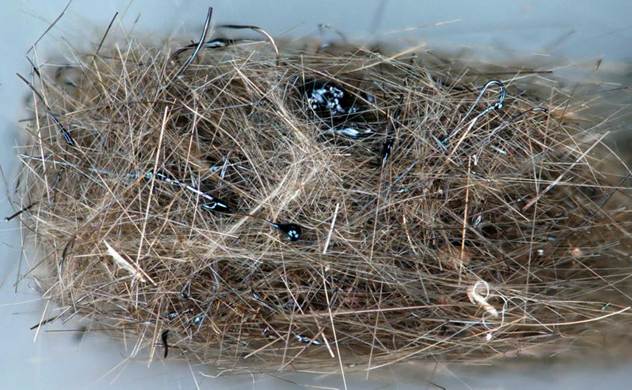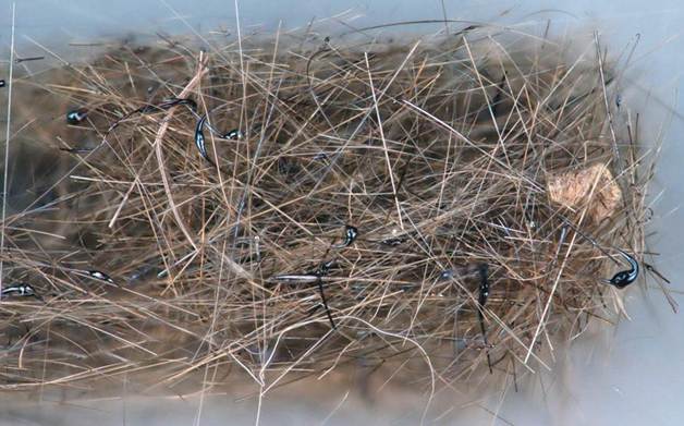 Pele’s Hair (above & below; above: field of view ~2.8 cm across; below: field of view ~3 cm across) - Pele’s hair refers to extremely long threads of brownish- to blackish-colored basalt glass (sideromelane & tachylite). It forms as very fluid basalt lava spray is stretched while airborne. Achneliths (Pele’s tears - the small, black, glassy structures) are often found attached to one end of individual threads. Multiple threads can be found attached to some achnelith masses.