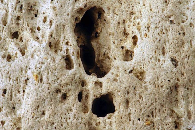 Rhyodacite pumice (above & below) from the late August 1883 eruption of Krakatoa Volcano, Indonesia. This sample floated in the Indian Ocean Basin for almost a year before washing ashore in eastern Africa. As is all pumice, this rock consists of highly porous, finely vesiculated volcanic glass. The abundance of gas bubbles (frothy texture) makes the rock lightweight. Many of the vesicles (gas bubbles) are noticeably stretched. Sample generously donated by Frank Brown.
