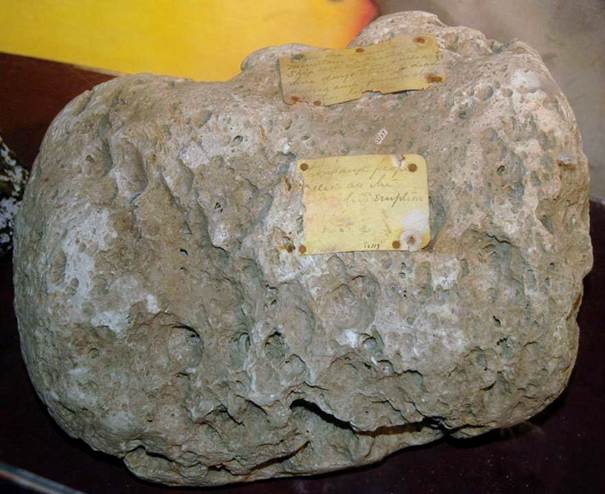The lower (incomplete) vintage label refers to how many thousands of people were killed from the eruption. The upper vintage label reads: "From the burning mountain of Krackatao. Ship H.W. Dudley sailed three days through dead bodies and pumice stone [from] this island."