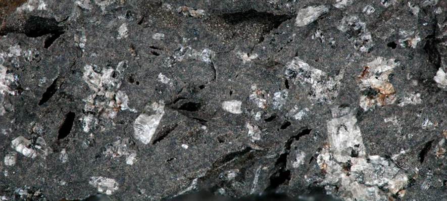 Magadi Trachyte (Plateau Trachyte) (field of view ~4.3 cm across) - vesicular porphyritic trachyte sample from an outcrop at the northern end of Lake Magadi, in the Kenya Rift segment of the East African Rift Valley.