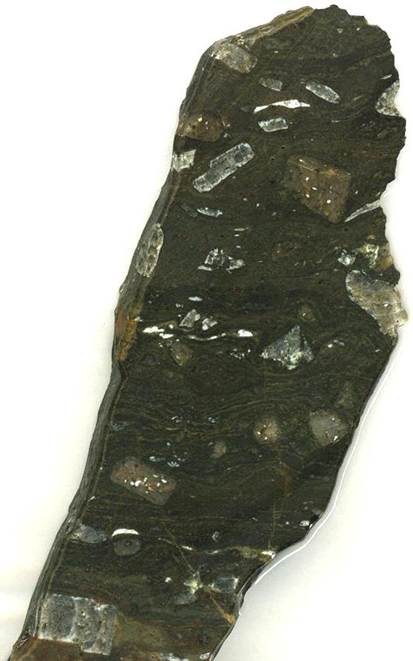 Porphyritic anorthoclase phonolite (6.6 cm across) - this second Mt. Kenya rock has the same chemistry and texture as a kenyte (= 1st rock shown above), but the dark-colored matrix of this porphyritic phonolite is more coarsely-crystalline than in kenyte, and also lacks flow-banding.