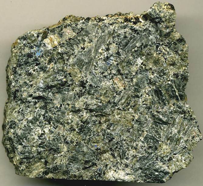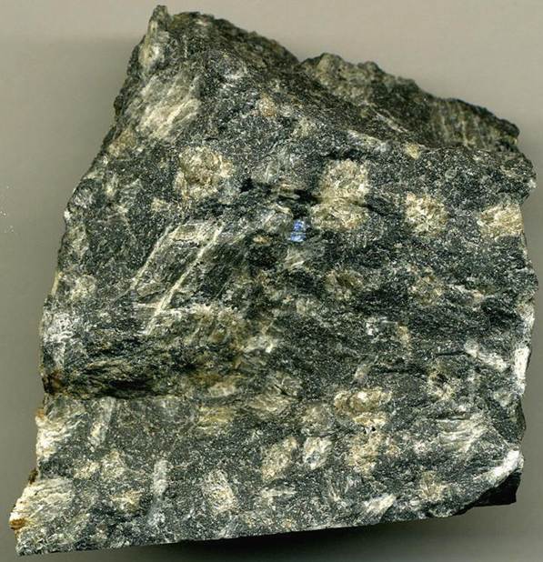 Porphyritic nepheline syenite (8.3 cm across) - this 3rd rock is derived from the summit spires of Mt. Kenya Volcano. It is a porphyritic nepheline syenite, a shallow intrusive igneous rock that filled up the throat of the old volcano.