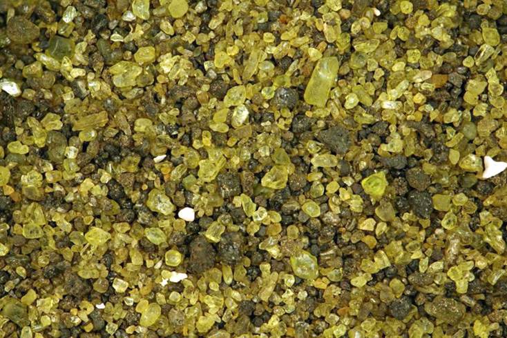 Olivine-basalt sand, Green Sand Beach, Puu Mahana Volcanic Cone, Hawaii Hotspot, central Pacific Basin. Most sand grains here are ~1 to 1.5 mm in size.