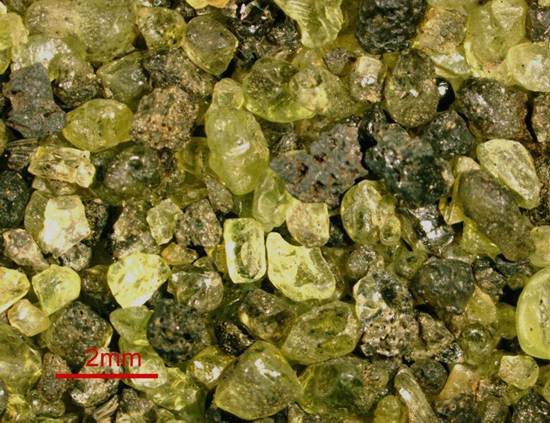 Olivine-basalt sand, Green Sand Beach, Puu Mahana Volcanic Cone, Hawaii Hotspot, central Pacific Basin. Most sand grains here subangular to angular. Microphotograph by Sara Beth Kopczynski.