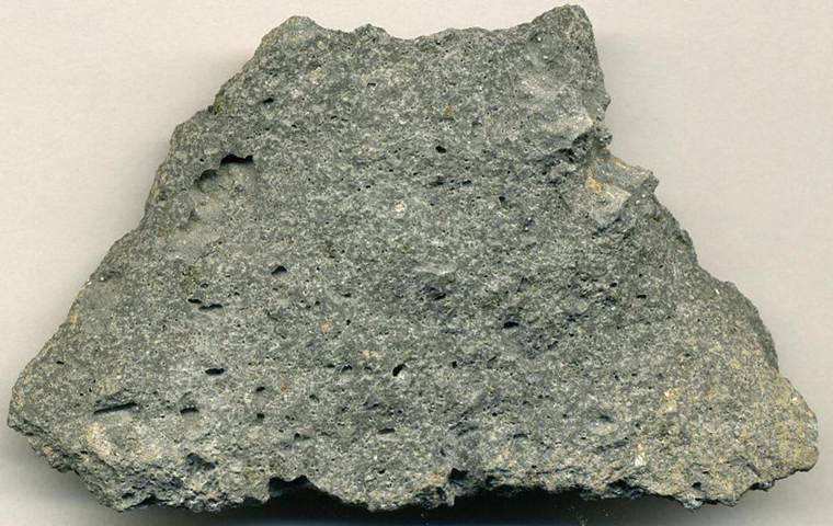 Sierra Grande Andesite (7.3 cm across at its widest) - vesicular andesite from lava flow on the eastern side of Sierra Grande Shield Volcano, Raton-Clayton Volcanic Field, northeastern New Mexico, USA (36° 42’ 24.26” North, 103° 47’ 46.75” West). This lava flow is from the upper Upper Pliocene, dating to 1.9 m.y. The rock consists of generally small phenocrysts of augite pyroxene, hypersthene pyroxene, olivine, and plagioclase in a glassy to microcrystalline groundmass dominated by feldspar, pyroxenes, plus some other minerals.