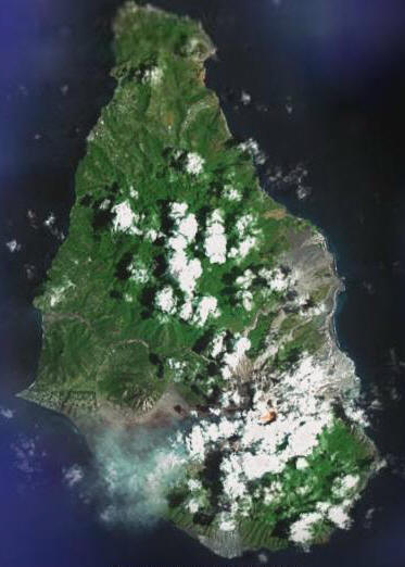 Montserrat - the Soufrière Hills Volcano is under the cloud cover in the southern part of the island.  The grayish-colored areas are recent ash deposits.