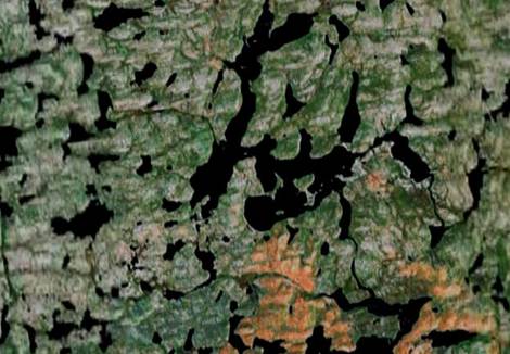 Satellite photo of 4.031 b.y. Acasta Gneiss locality, along the Acasta River, in the southern part of the hook-shaped peninsula along that river - see center of photo. (satellite photo provided by TerraMetrics-Google Earth)