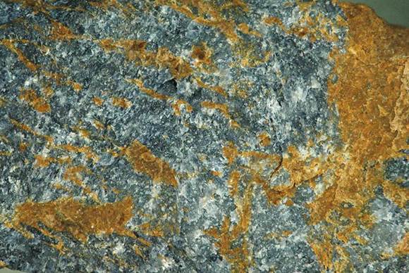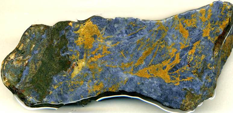 Corundite is a remarkable metamorphic rock. Apart from its attractive bluish color and wisps of yellow-brown, its composition and origin are quite unusual. Corundite (a.k.a. emery rock) is dominated by corundum, a very hard (H ≡9) aluminum oxide mineral (Al2O3). Because it’s blue corundum, it can be called sapphire. Rock-forming corundum is rare (as is rock-forming diamond, but see diamondite).