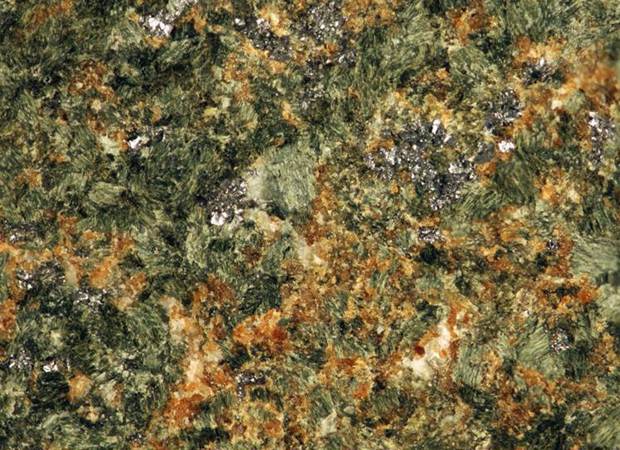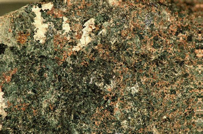 Skarn (field of view ~2.0 cm across) with andradite garnet (reddish brown), diopside pyroxene (green), and molybdenite (silvery gray).