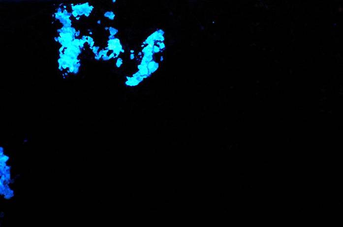 Skarn (above & below; ~4.6 cm across) with andradite garnet (reddish brown), diopside pyroxene (dark green), molybdenite (silver), and scheelite (white). How do I know the white stuff is scheelite? Well, scheelite fluoresces bright blue under ultraviolet (UV) light - see the photo below. The garnet, pyroxene, and molybdenite don't fluoresce under UV light.