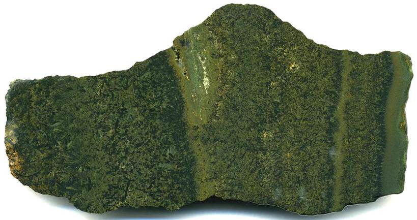 Ilvaite-hedenbergite skarn (cut surface; 11.4 cm across) having ilvaite (black) and hedenbergite (greenish-gray).