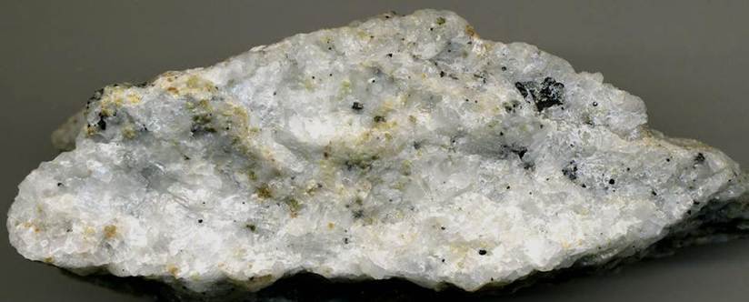 The tactite shown below is from a classic locality along the York River near Bancroft, Ontario, Canada. This is a marble having calcite (whitish-grayish - CaCO3), ferroan spinel (black - MgAl2O4 with Fe), periclase (MgO), and Mg-Ti borate minerals.