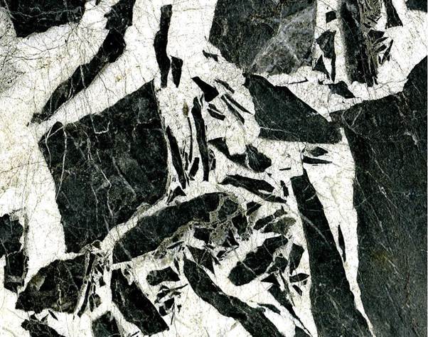 Tectonic breccias in the commercial decorative stone trade are typically called “marbles”.  By definition, any breccia will have abundant large angular fragments.  The tectonic breccias are generated by intense tectonic crushing and fracturing along fault zones in orogenic belts.  Cut & polished samples are typically bicolored or multicolored and are quite striking in appearance.