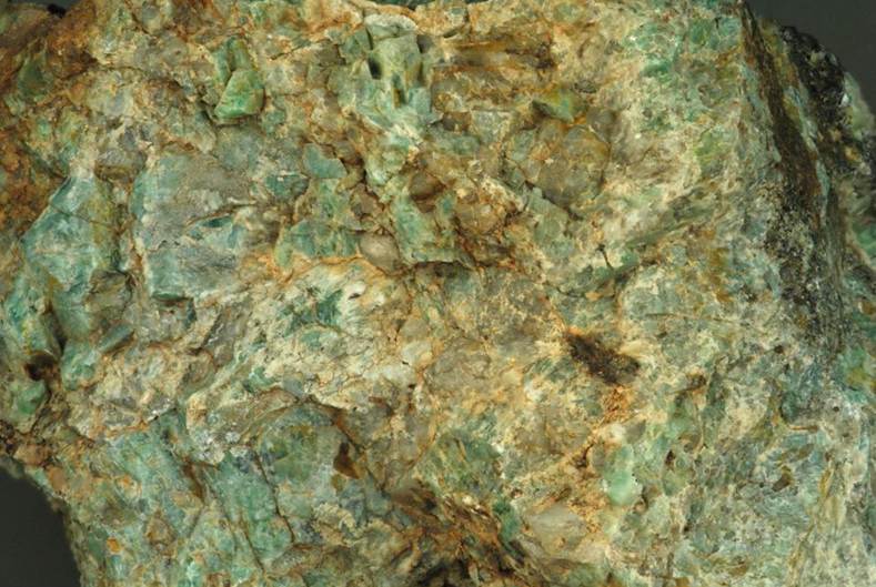 Green orthoclase feldspar (field of view ~9 cm across) from Southern Cross, ~11-12 km N of the city of Broken Hill, Broken Hill Block, far-western New South Wales, southeastern Australia.