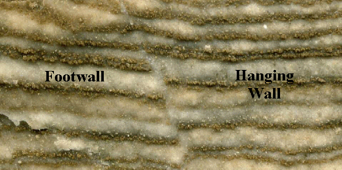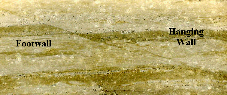 Normal fault (above & below; cross-section view; field of view: 3.1 cm across) in hard, argillaceous limestone (Silurian). Normal faults result from extensional stress, and involve downward movement of the hanging wall and upward movement of the footwall.