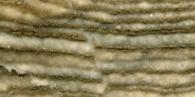 Reverse fault (above & below; cross-section view; field of view: 2.4 cm across) in finely-laminated rock gypsum (Castile Formation, upper Upper Permian). Reverse faults result from compressional stress, and involve upward movement of the hanging wall and downward movement of the footwall.