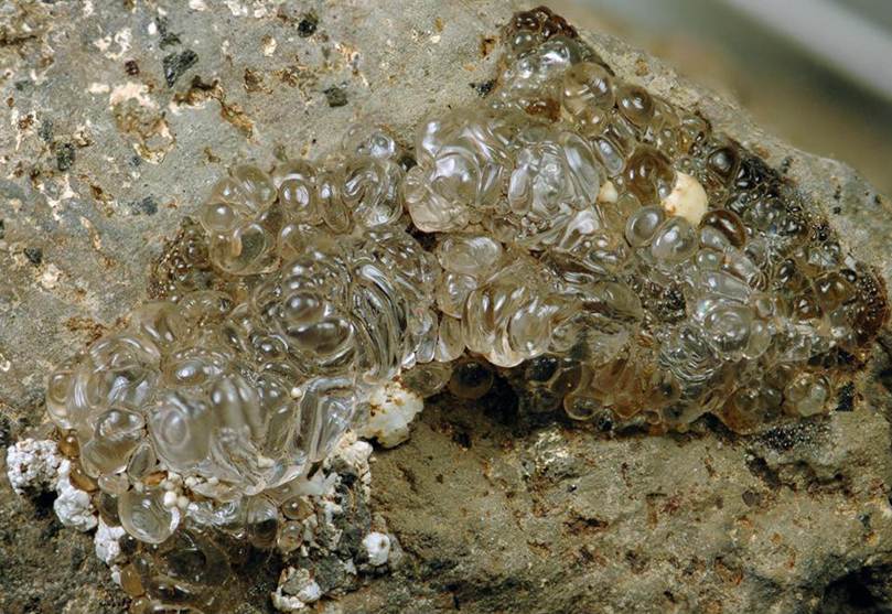 The photos below show a clear-as-water, sap-like substance on a rock. This beautiful material is hyalite opal (a.k.a. glass opal) from Bohemia. Hyalite is also known as opal-AN, referring to amorphous opal having a network structure similar to silica glass, rather than opal consisting of silica gel spheres/colloids (most opal is this latter type). Hyalite opal is still hydrous silica (SiO2·nH2O). Under ultraviolet light (UV light; black light), this hyalite has a weak greenish glow.