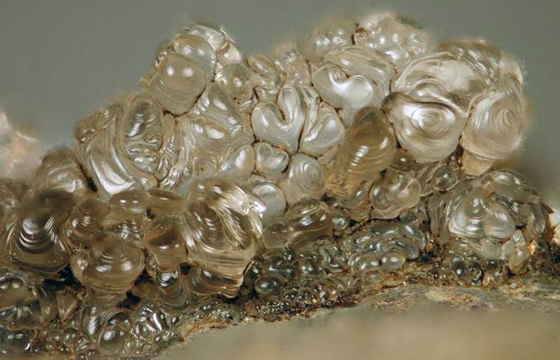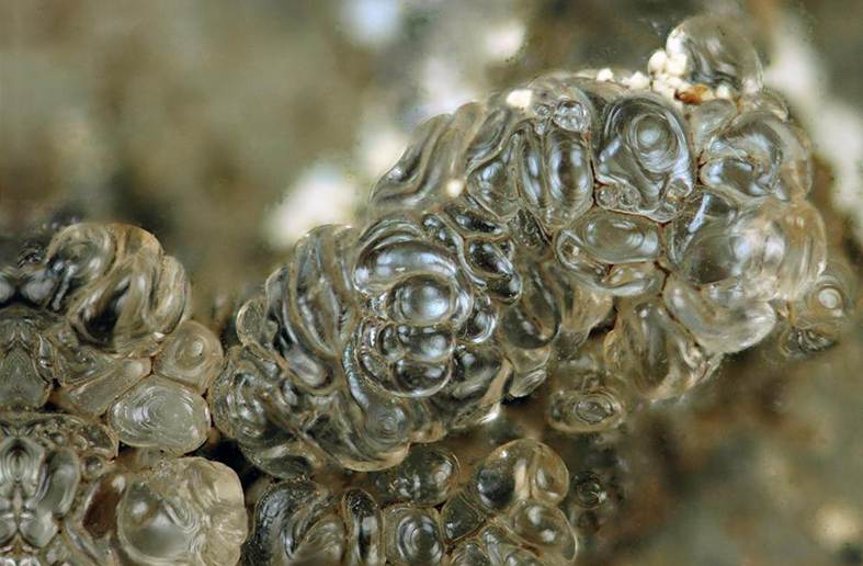 Hyalite opal (clear) (field of view ~2.4 cm across) from the upper Doupov Volcanic Complex (lowermost Oligocene to Lower Miocene) in the Doupov Mountains, northwestern Bohemia.