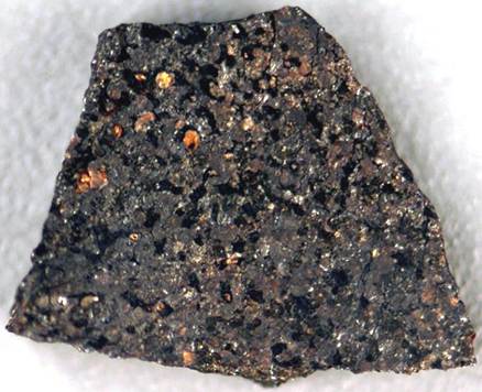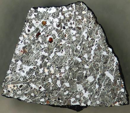 Acapulcoite slice (above & below; 1.3 cm across at its widest) showing microcrystalline texture and mixture of mafic silicate minerals & iron-nickel metal. The Fe-Ni metal shows up black in the photo above & bright silver in the photo below. Note the thin veins of metal running through the rock. This is characteristic of acapulcoites.
