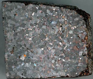 Brachinites have been inferred to be residual mantle rocks or possibly recrystallized igneous cumulate rocks. They appear to have come from a differentiated planetary body in the asteroid belt that has since broken apart. Research has indicated that the Nenetta Asteroid may be the parent body of brachinites. This brachinite shown below does not yet have a published age, but other brachinites date to 4.56 billion years.