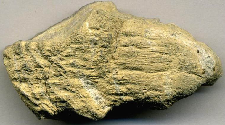 Kofelsite (4.1 cm across) - kofelsites (also spelled “koefelsites” and “köfelsites”) have the appearance, texture, and feel of pumice. Samples are often called "pumice of Köfels". They date to about 7815 B.C. (± 100 years) (near-earliest Holocene). The specific origin of kofelsite rocks is uncertain & debated. The rocks are found in a landslide deposit in western Austria. Researchers have suggested that the landslide was impact-triggered. The kofelsite samples in the landslide deposit thus may be impactites (fused rocks from the heat of impact). Some workers have suggested that the rocks are frictionites (fused rocks from landslide heating).