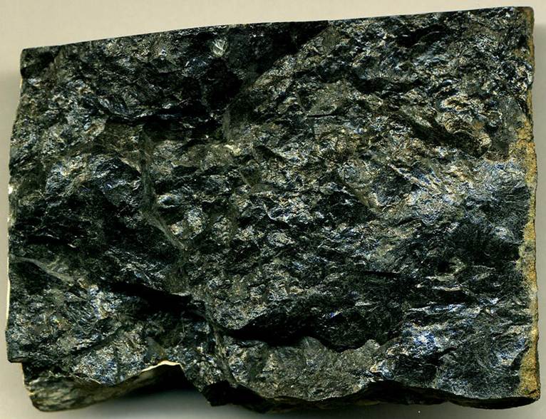 Obsidian is an uncommon igneous rock that varies in chemistry from felsic to intermediate to mafic to alkaline. Chemical analysis can show whether an obsidian is rhyolitic, dacitic, etc. The rock shown below is a trachyte obsidian from a small volcano in the East African Rift Valley called Ol Doinyo Nyukie (several variant spellings exist). Eastern Africa is being ripped apart by the Afar Hotspot and quite a few volcanoes having unusual lava chemistries are present along the rift zone. Ol Doinyo Nyukie is a Quaternary-aged volcano that has principally erupted phonolites and trachytes - both lithologies are intermediate extrusive igneous rocks noticeably high in alkali content (sodium & potassium). This rock is almost 100% glass, but there are some small, scattered phenocrysts of feldspar.
