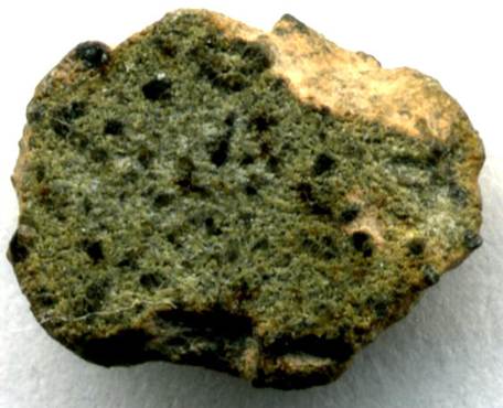 Shergottite (NWA 2373) (6 mm across) - this is a small sample from the NWA 2373 Meteorite (NWA = "Northwest Africa"). The light brown-colored material is the outer weathered surface of the rock. The greenish and black speckled surface shows the crystal & mineral make-up of the rock itself. Mineral analysis performed by Theodore Bunch and James Wittke at Northern Arizona University has shown the rock is principally composed of olivine, pigeonite pyroxene, augite pyroxene, plagioclase feldspar glass (maskelynite), chromite, Ti-magnetite, chlorapatite, and trace amounts of other minerals. It looks like an ultramafic rock, but it's apparently a basaltic shergottite (also regarded as a picritic shergottite).