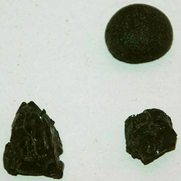 Indochinite - broken chips from the interior of a specimen from South China. Left: 1.7 cm across; right: 1.8 cm across.