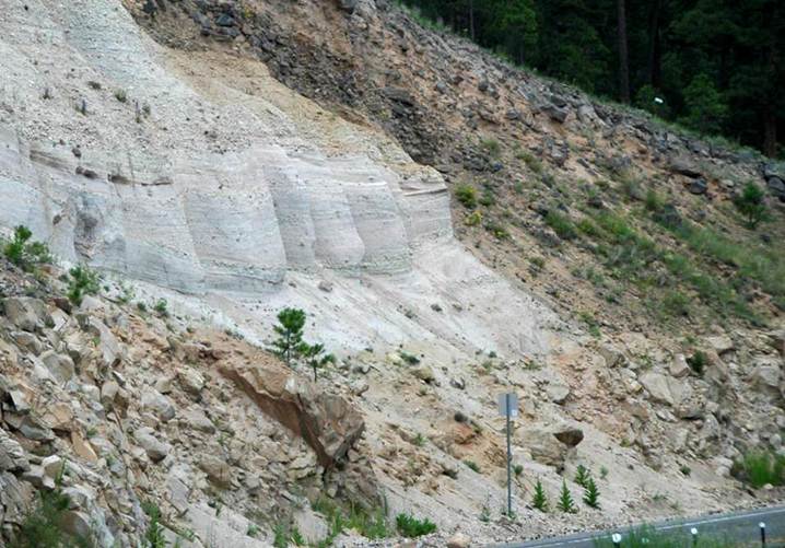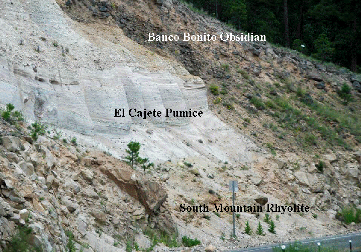 Three Rhyolites Roadcut (above & below) along Rt. 4 near the southern margin of the Valles Caldera, northern New Mexico, USA (35° 49’ 41.48” North, 106° 35’ 32.07” West). The three volcanic units exposed here have the same chemistry (rhyolitic), but are remarkably different in terms of rock texture and origin (eruptive style). The blocky-weathering lower unit is the South Mountain Rhyolite (521 k.y.). The whitish-gray, layered ash-pumice unit above that is the El Cajete Pumice (55-60 k.y.). The blackish, blocky-weathering unit at the top is the Banco Bonito Obsidian (50-55 k.y.).