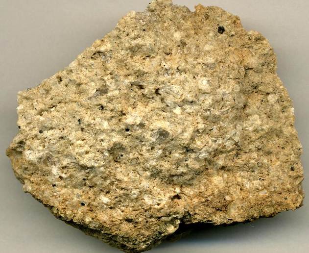Rhyolitic volcanic breccia (6.2 cm across at its widest) - this pyroclastic flow breccia is from the South Mountain Rhyolite. It formed during the middle Middle Pleistocene, at about 521 k.y., from post-caldera volcanic activity at Valles Caldera. This sample comes from the basal unit exposed in the Three Rhyolites roadcut shown above.