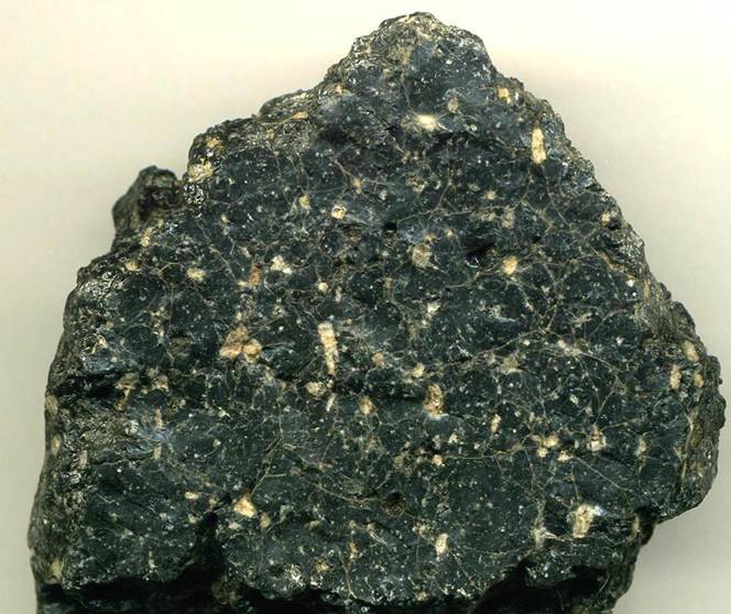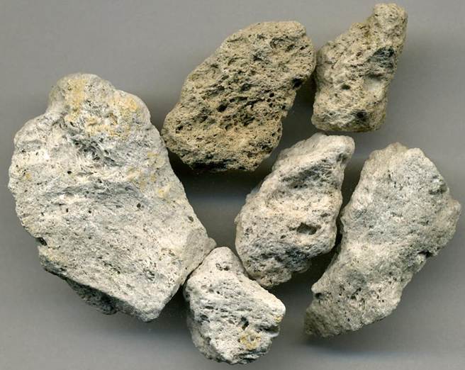 Rhyolitic pumice (specimen at left is 3.4 cm from top to bottom) - these pumice samples are from the El Cajete Pumice (see whitish middle unit in roadcut photo above). Material from this unit represents air-fall pumice deposits and pyroclastic surge deposits. The El Cajete Pumice was deposited during the Late Pleistocene, at about 55-60 k.y., from a volcanic center in the Valles Caldera. This sample comes from a roadcut along the northern side of Rt. 4, ~3.9 miles east of the Three Rhyolites roadcut shown above (35° 48’ 55.94” North, 106° 32’ 40.64” West).