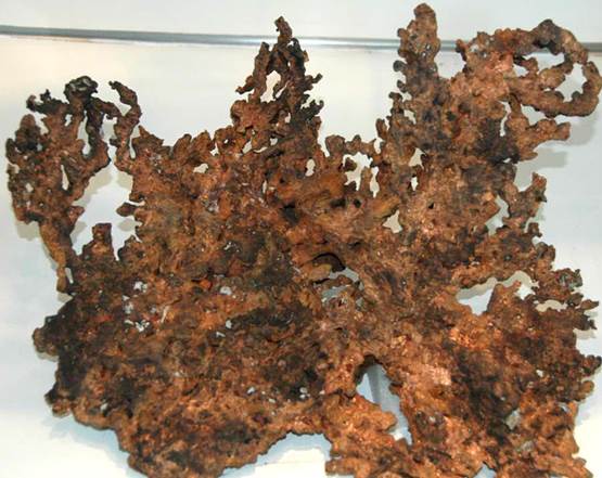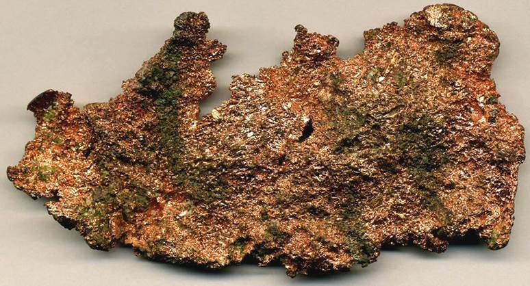 colored. Copper tends to form sharp-edged, irregular, twisted masses of