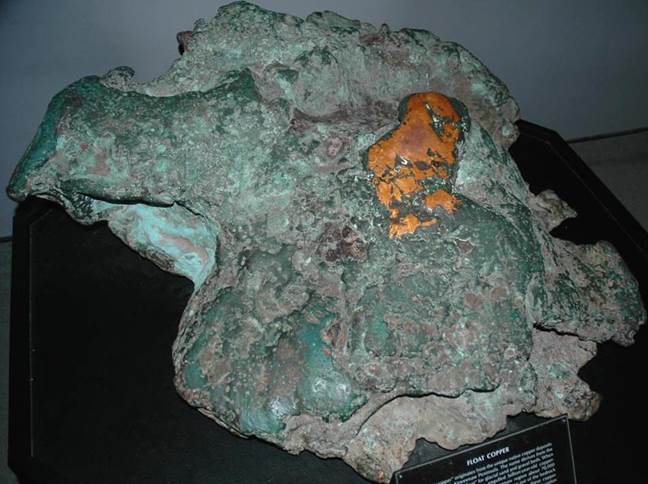 - large, 1.1 ton glacial boulder of oxidized native copper (~1050-1060 million
