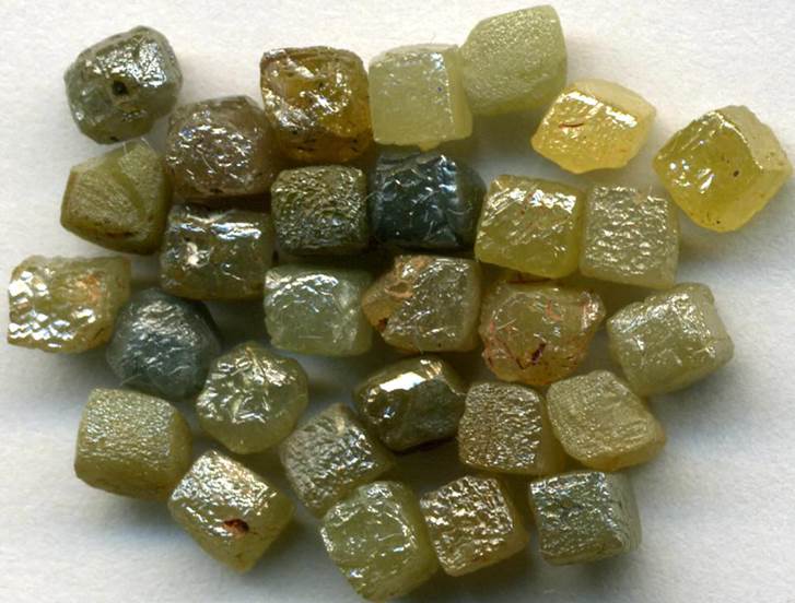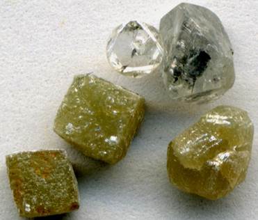 from Africa - three yellowish-gray cubic diamonds & two clearish octahedral