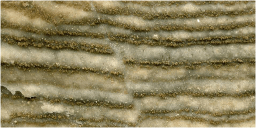 in finely-laminated rock gypsum (Castile Formation, upper Upper Permian).