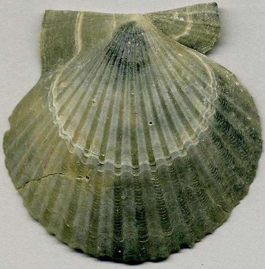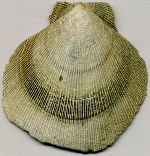 & below) (4.9 cm across at its widest) - this fossil scallop shell is from