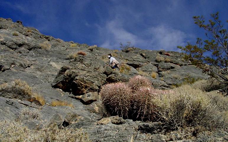 Geologist climbing a steep limestone cliff in the southern Funeral Mountains,