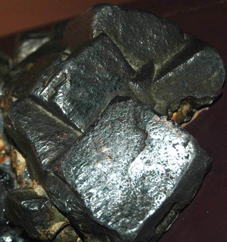 a metallic luster, silvery-gray color, cubic crystals, cubic cleavage, is