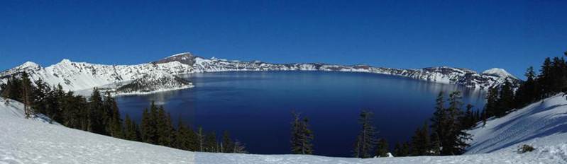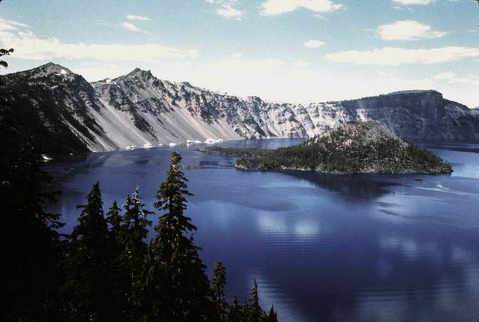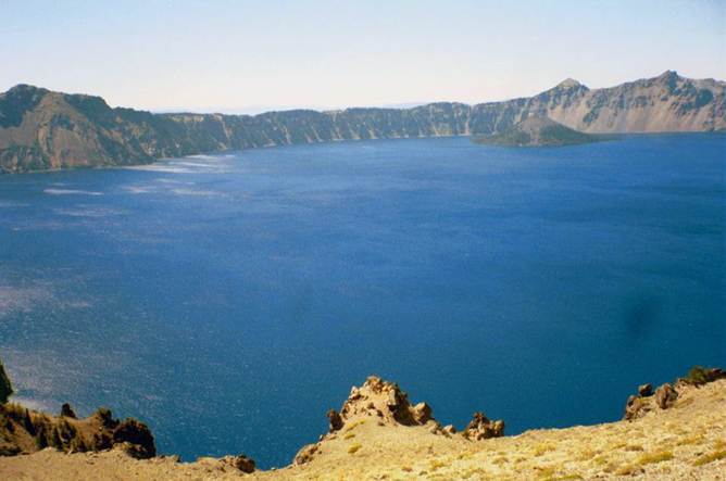Crater Lake Caldera and Wizard Island. The caldera formed ~7700 years ago during an enormous, explosive, ash and pumice eruption of Mt. Mazama, a subduction zone stratovolcano in the Oregon portion of the Cascade Range. Wizard Island is a cinder cone.