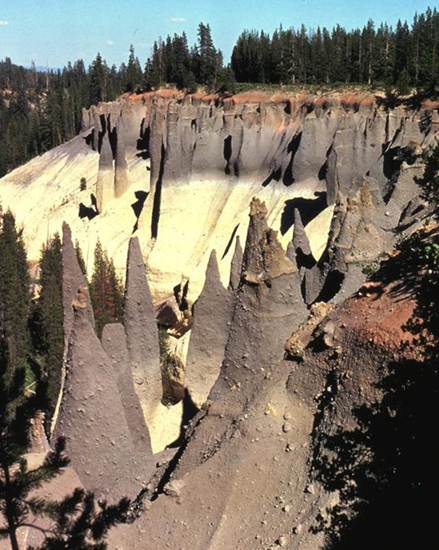 The tower structures, or "Pinnacles", are the result of preferential lithification by fumarolic (steam vent) activity when the deposit was fresh. Differential erosion has removed the loosely consolidated ash-and-pumice/scoria materials.