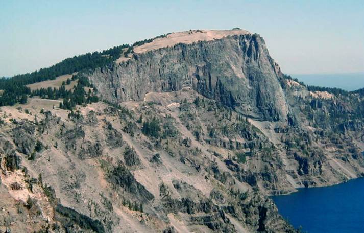 Llao Rock at rim of Crater Lake Caldera. Medium gray = rhyodacite lava. Light gray at top = rhyodacite ash & pumice from Mt. Mazama caldera-forming eruption ~7700 years ago.
